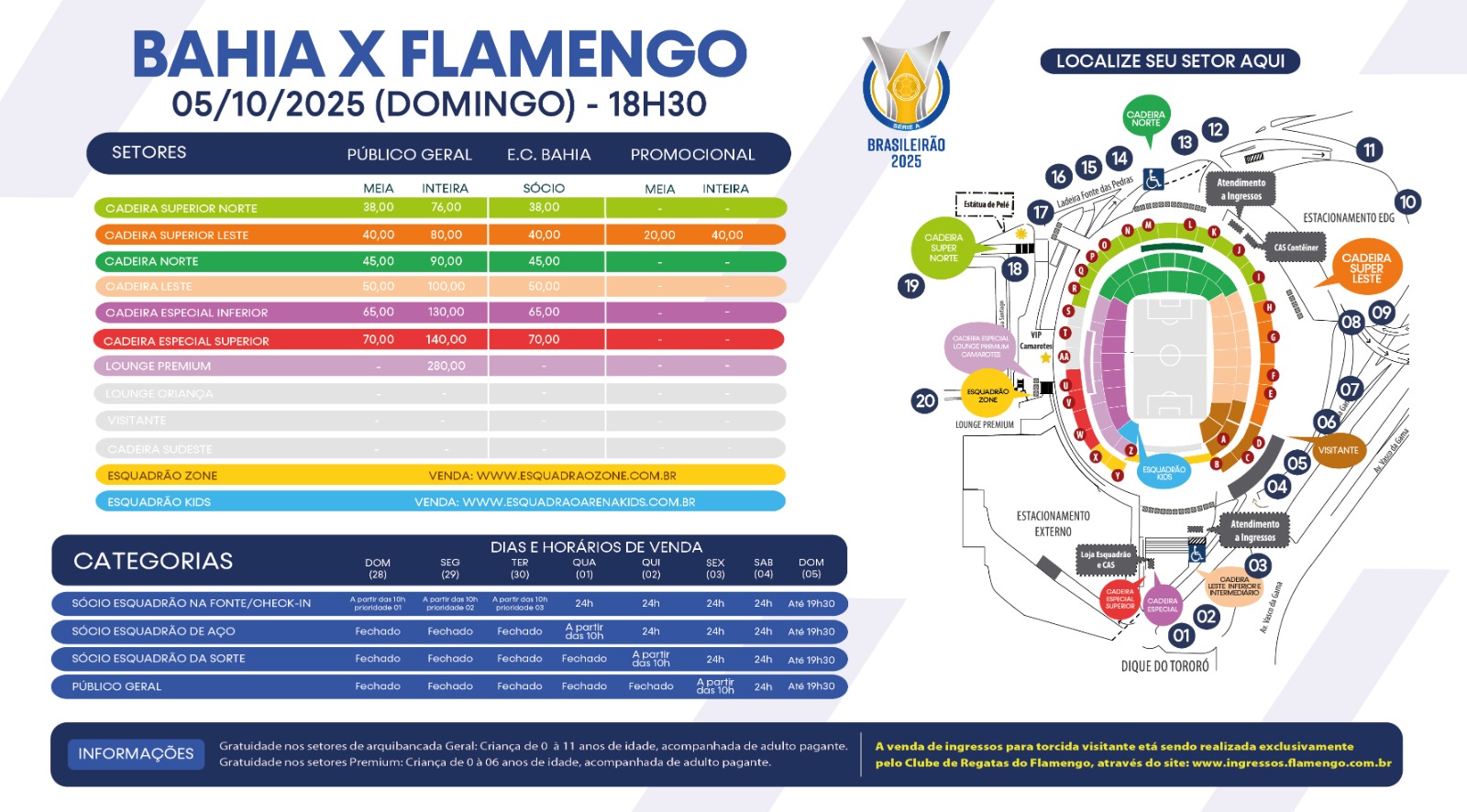 Domingo (05/10) às 18:30h tem disputa entre Bahia e Flamengo, para acompanhar esse jogo de perto fique ligado nas informações de venda: