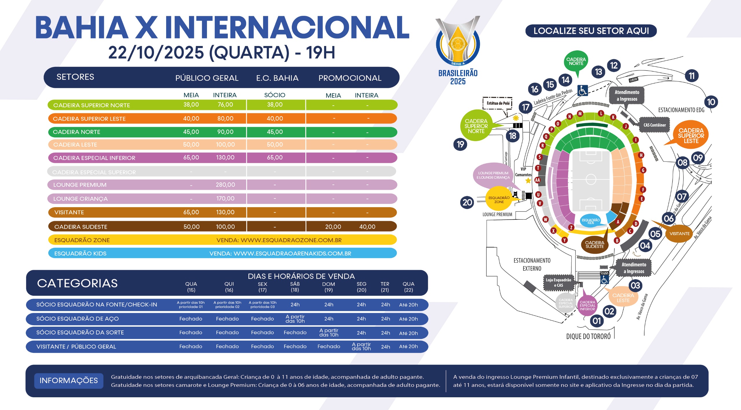 Quarta (22/10) às 19h tem disputa entre Bahia e Internacional, para acompanhar esse jogo de perto fique ligado nas informações de venda: